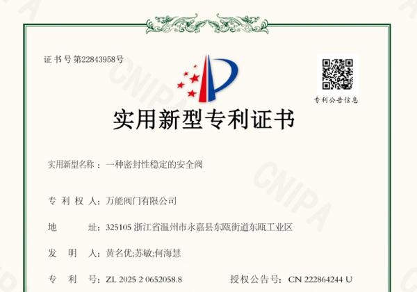 近日,萬能閥門有限公司再傳捷報,其研發(fā)的一種密封性穩(wěn)定的安全閥技術(shù)獲得國家知識產(chǎn)權(quán)局正式授權(quán),專利號為 ZL 2025 2 0652058.8,授權(quán)公告號為 CN 222864244 U。該項專利的取得,標志著萬能閥門在安全閥密封性能領(lǐng)域?qū)崿F(xiàn)了又一次關(guān)鍵性突破,也再次印證了企業(yè)在壓力安全控制技術(shù)方面的研發(fā)實力和創(chuàng)新能力。