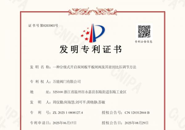 近日,萬能閥門有限公司傳來喜訊,公司成功取得一項(xiàng)名為“分級(jí)式開啟雙閘板平板閘閥及其密封比壓調(diào)節(jié)方法”的國家專利(專利號(hào):ZL 2025 1 0808127.4,授權(quán)公告號(hào):CN 120312844 B)。這一成果標(biāo)志著企業(yè)在平板閘閥研發(fā)與制造領(lǐng)域再次取得突破,也進(jìn)一步彰顯了公司持續(xù)創(chuàng)新與注重品質(zhì)的理念。